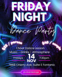 Come learn to Dance with Tom & Andrea Cordova – Caddes and then put your skills to use on the dance floor. You will enjoy the lights & atmosphere of a nightclub without going to a nightclub! Grab your partner or your friends and come down for a fun night!